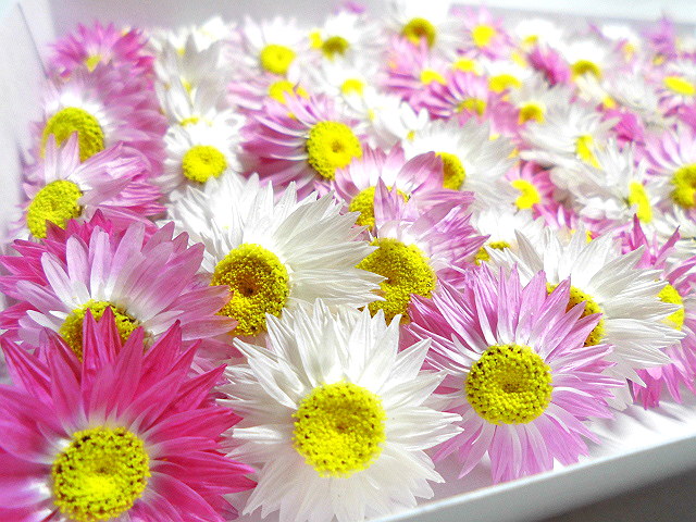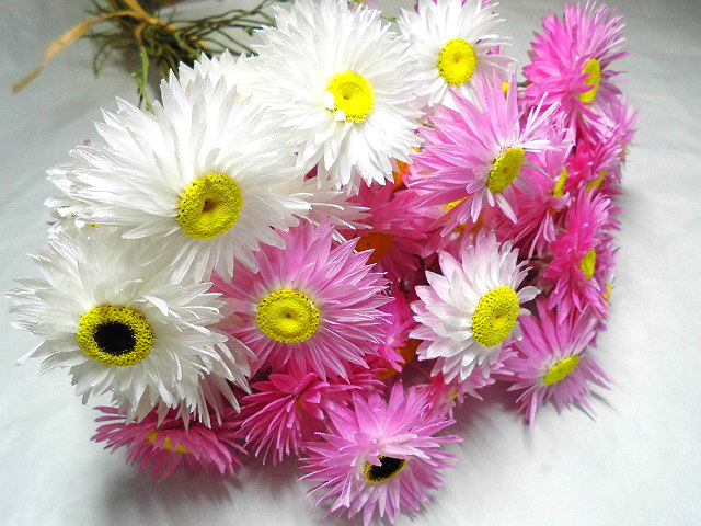 アクロクリニウムは花が簪に見えることから和名で花簪(ハナカンザシ)と呼ばれ切花として流通しています。キク科のローダンセ属一年草。英名ではpaper daisyと呼ばれる程、カサカサした質感が特徴です。