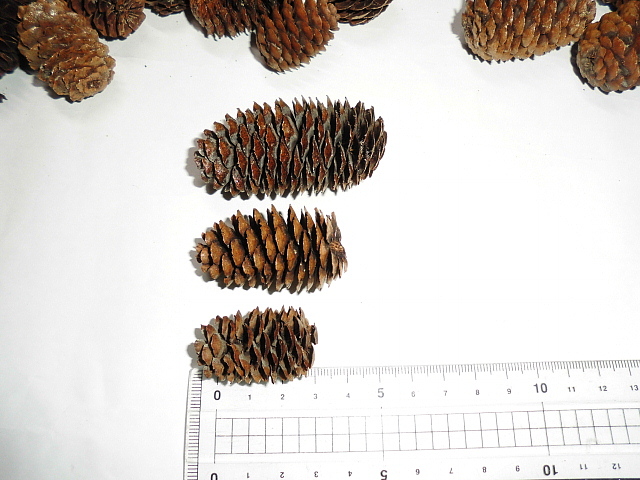 このエゾマツは20m以上の巨木で、木登りをして採取出来ませんので、落下物採取品となります。日々落下するものを日を置かず採取していますので、形の良い物が揃っています。本年の初秋から採取したものを一度天日でしっかり開かせた後、洗浄し、消毒をした後、もう一度天日で完全に乾燥させます。そして細かなホコリや松ヤニを丁寧に筆を入れて落としています。着色や脱色をしない自然の美しい色合いですので、ぜひ秋、冬の作品にお使い下さい。